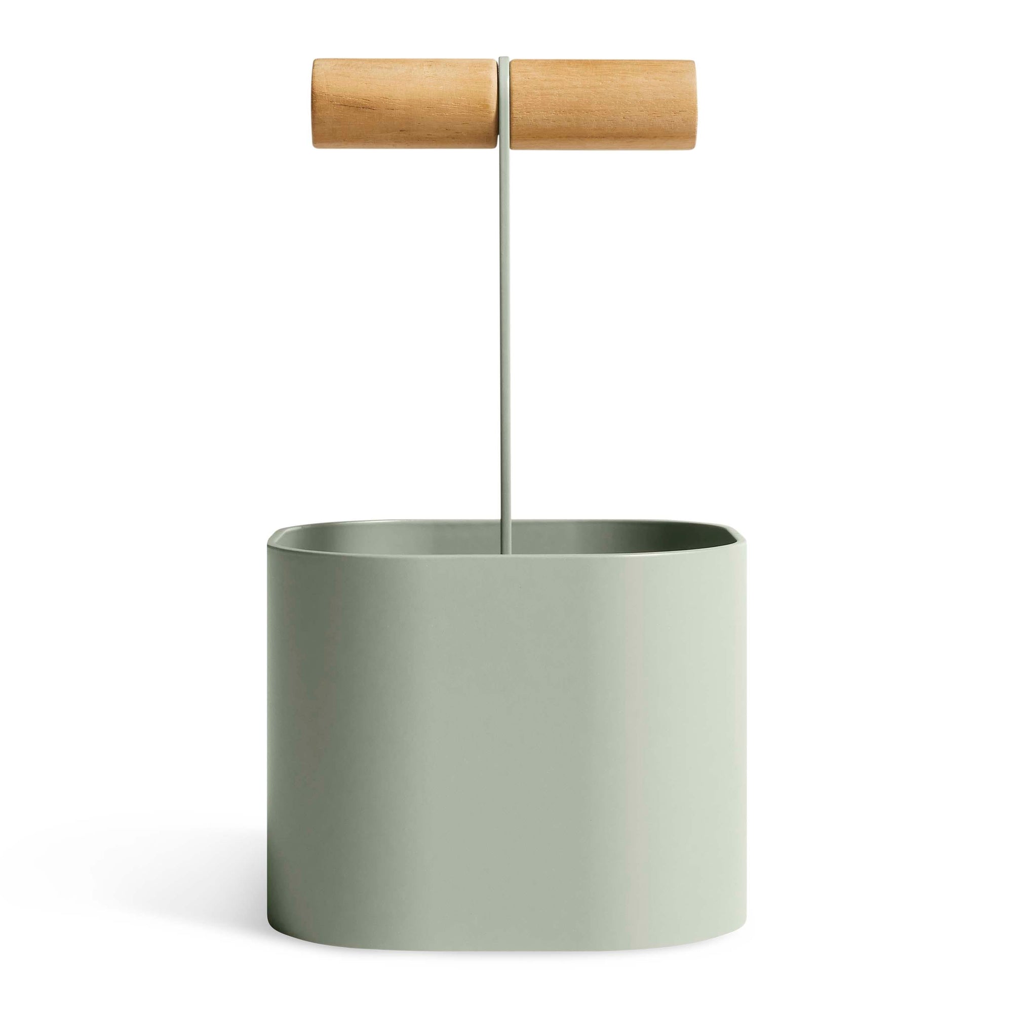 FSCĀ®-certified teak wood handle adorns powder-coated aluminum to give this intrepid caddy a little flair and a good deal of functionality. Holds toothbrushes, art supplies, essential oils, more art supplies.
