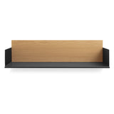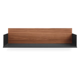 Wall-mounted powder-coated steel shelf with a walnut or white oak back panel turns any wall into an opportunity. Pair with companion cabinet and desk units to create a full-on storage masterpiece.