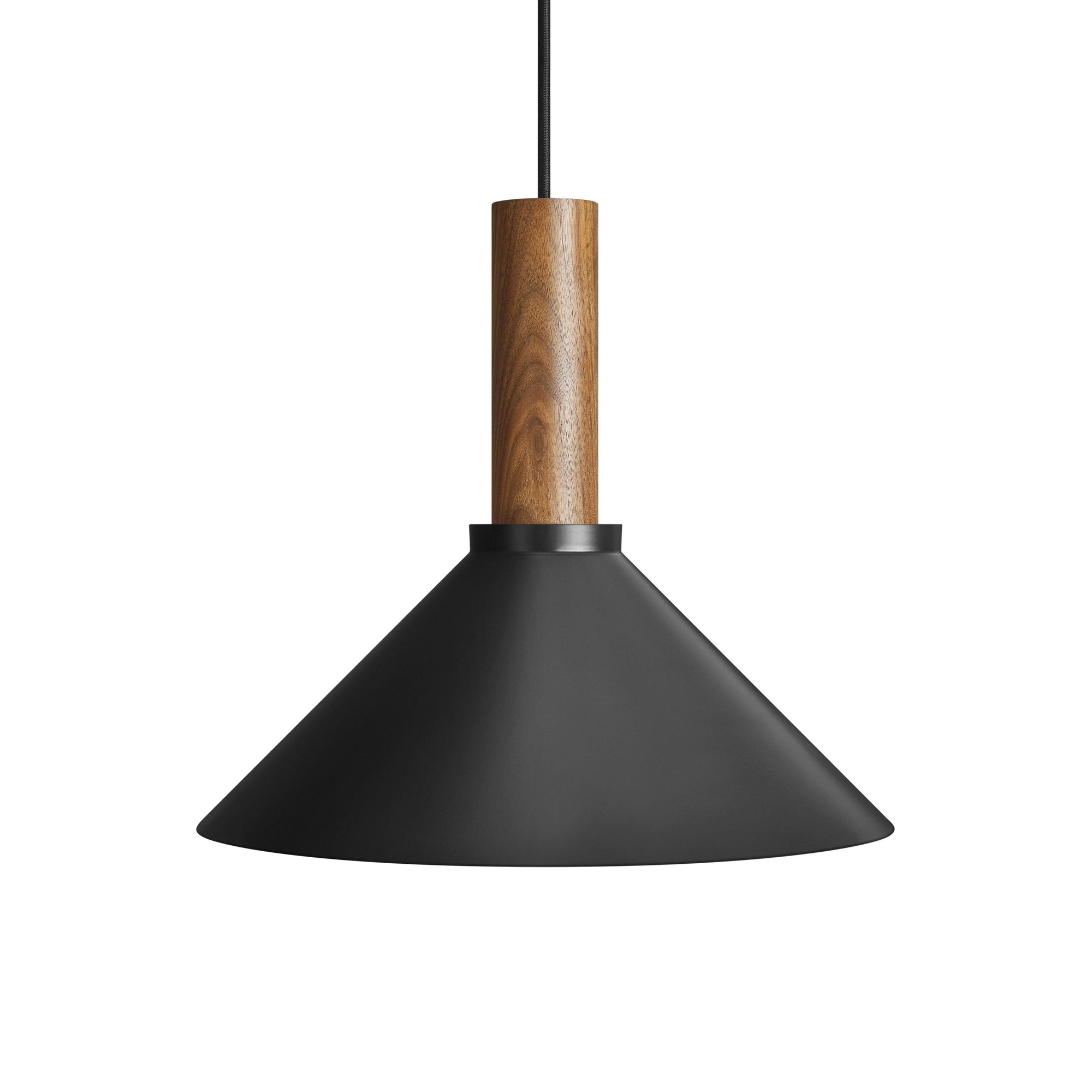 A genial powder-coated steel shade hugs an elegant wood stem to create a joyful juxtaposition of materials. Designed to let light shine through the top of the shade for a warm touch and added delight. Three sizes and multiple glorious colors to choose from. Mix and match as you please. Mounts from the ceiling.