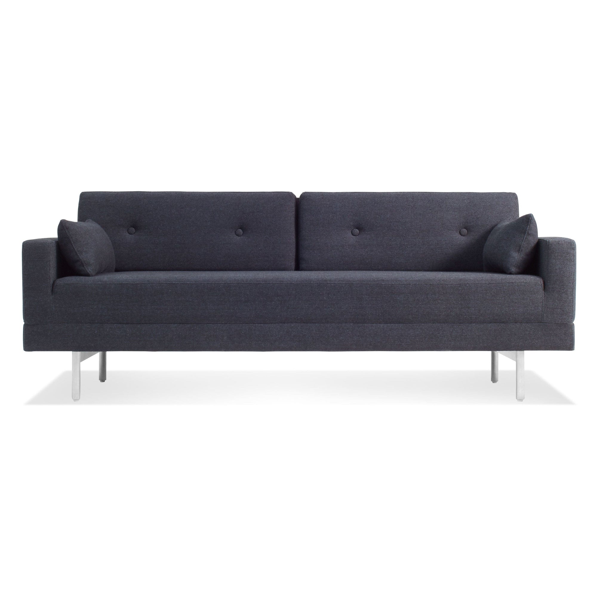 It’s a modern sofa bed that doesn’t look like one. Sort of like a wolf in sheep’s clothing. Just remove the back cushions and flip the seat forward. Voilà, instant queen-sized mattress. Brushed stainless steel leg.