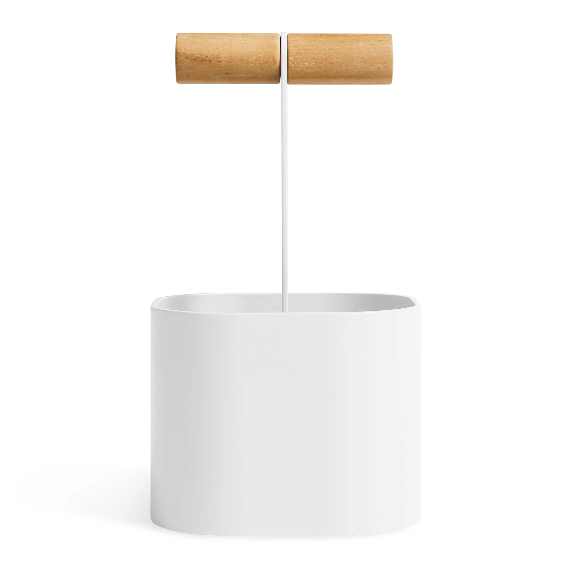 FSC®-certified teak wood handle adorns powder-coated aluminum to give this intrepid caddy a little flair and a good deal of functionality. Holds toothbrushes, art supplies, essential oils, more art supplies.