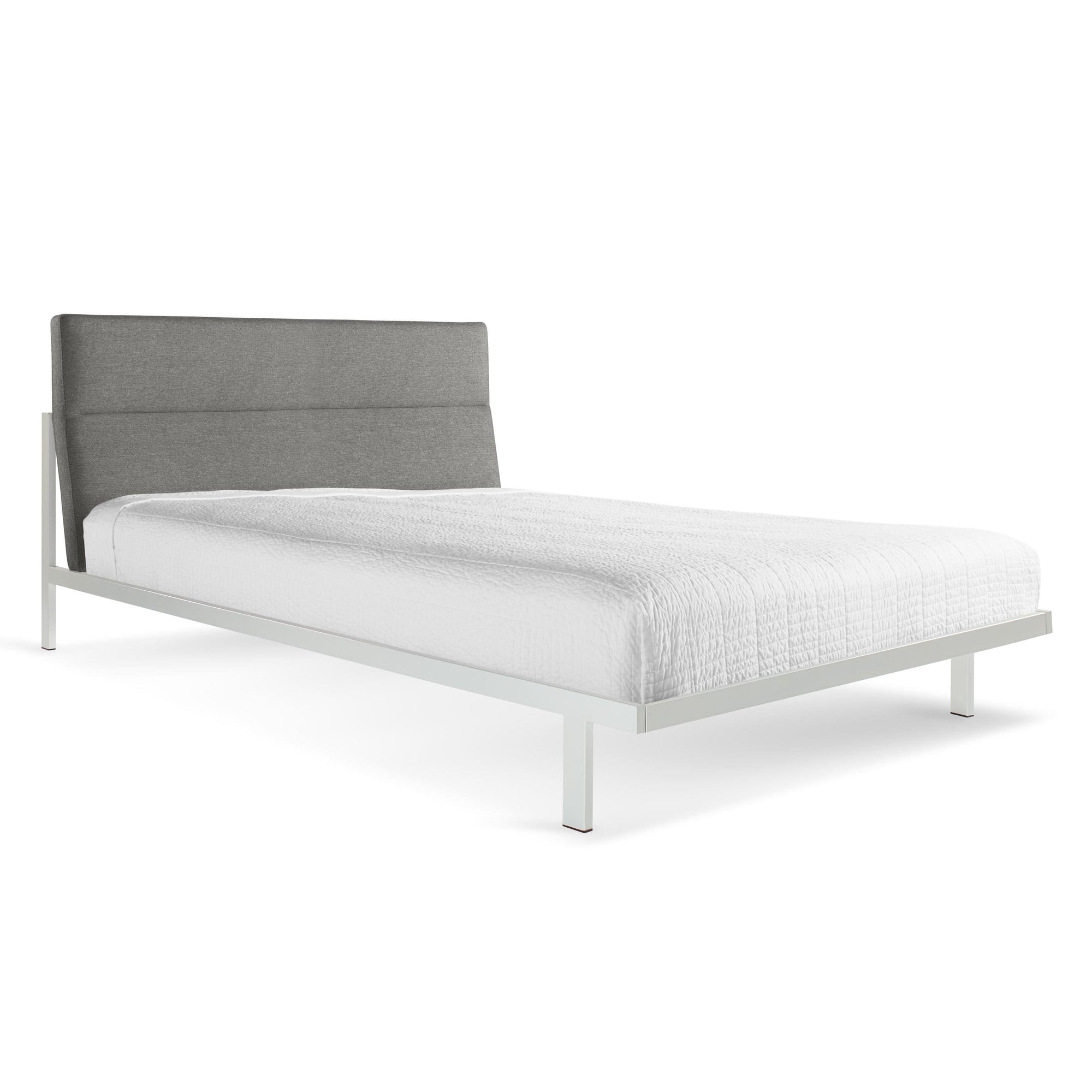 A durable glossy steel frame unites with the soft recline of a padded upholstered headboard. Two forms joining forces for a little bit of drama and hopefully some hijinks.